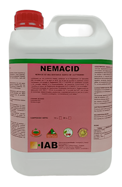 NEMACID está formulado con biolactato y lactoferrinas y actúa como un bioprotector de uso radicular con efecto fungistático. Además el uso de Nemacid favorece el intercambio catiónico del calcio entre el suelo y la cobertura vitelina de las estructuras generadas por Nematodos facilitando con ello un colapso estructural de los tumores o agallas. Su composición de lactosuero como sustancia básica está amparada en el reglamento de ejecución UE 560/2016 y esta regulado su uso como insumo ecológico.